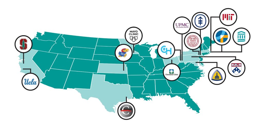 The Brigham and Women’s Hospital, Children’s Hospital of Philadelphia, Cleveland Clinic, Dana-Farber Cancer Institute, Johns Hopkins University, Massachusetts Institute of Technology, The Mayo Clinic, Memorial Sloan Kettering, Stanford University, University of California Los Angeles, University of Kansas Medical Center, University of Pennsylvania, University of Pittsburgh Medical Center, The University of Texas MD Anderson Cancer Center, and Weill Cornell Medicine.